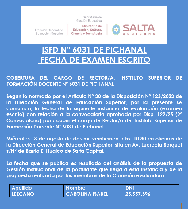 Convocatoria Disp. 353/24 y Disp. 122/25 cobertura de cargo de Rector del Instituto Superior de Formación Docente N° 6031